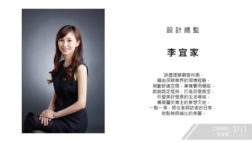 攜手旗下專業設計師們,依隨案場項目定位的不同,提供囊括選址、風格至風水配置、門禁設備、消防檢討等全方位服務,而其縝密精美的工藝細節,更讓之餘設計受到廣大客戶信任、喜愛;相信今後,李總監能持續率領團隊精進自我、創新突破,構築更多兼具多元機能及業主品味之作!