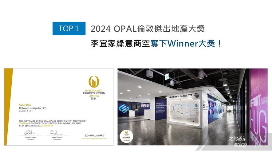 OPAL(英國倫敦傑出地產大獎)由全球知名企業集團Farmani Group組織,力求各地最富創造力、革新感、社會影響力與永續性的設計方案。李宜家總監於作品《Synergy》中,透過交織沉穩藍調及清新純白,輔綴花草植物與幾何線條圖樣,營造活力滿盈的辦公環境,獲得本屆賽事「Winner」殊榮!