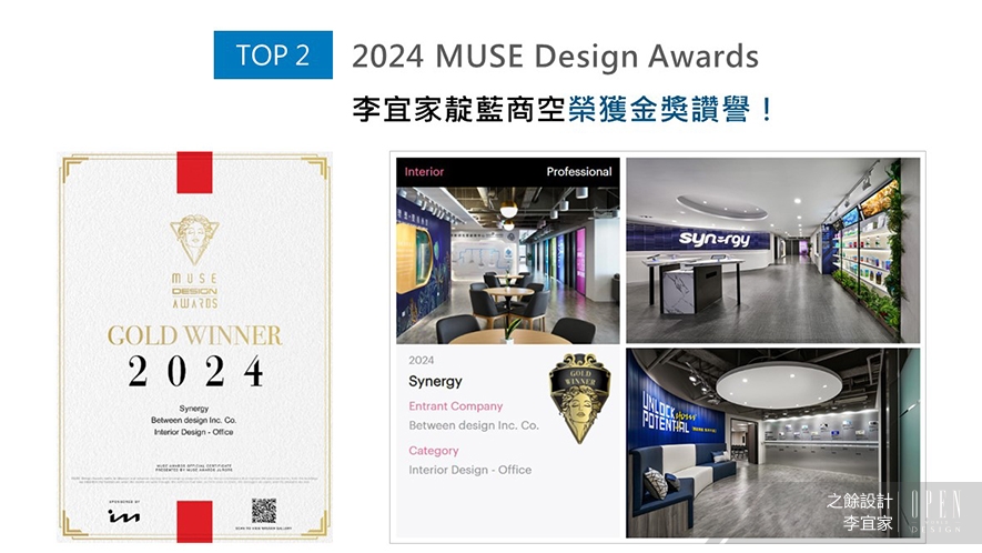 TITAN Property Awards以充滿力量和堅實氣息的摩艾石像為標誌,為建築、景觀、室內設計、房地產等領域提供全面的發光舞台。思及業主為規模甚大的外商公司,商空劃設通往辦公、接待、培訓區域的三條獨立動線,打造分流清晰的便捷商業空間《Synergy》,一舉奪下「金獎」不斐佳績!