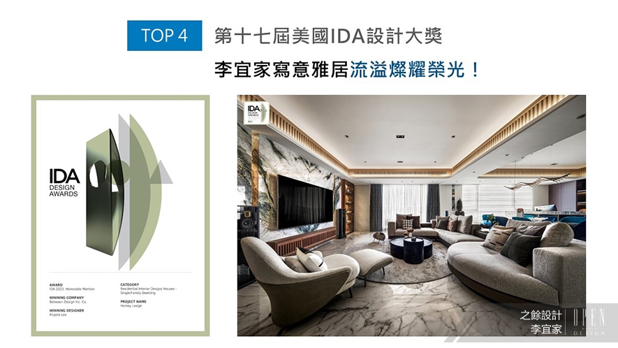 李宜家總監配合居者的琉璃及文物收藏,運用台灣製造的大理石與木材,搭配具現代氣息的鍍鈦板,共組混搭在地特色及時尚風韻的中式美學,雍雅吸睛的《悅閑居》參賽2023美國IDA國際設計大獎,便撥動眾評審們的心弦,摘獲「Honorable Mention」獎項,再度締下優異成績!