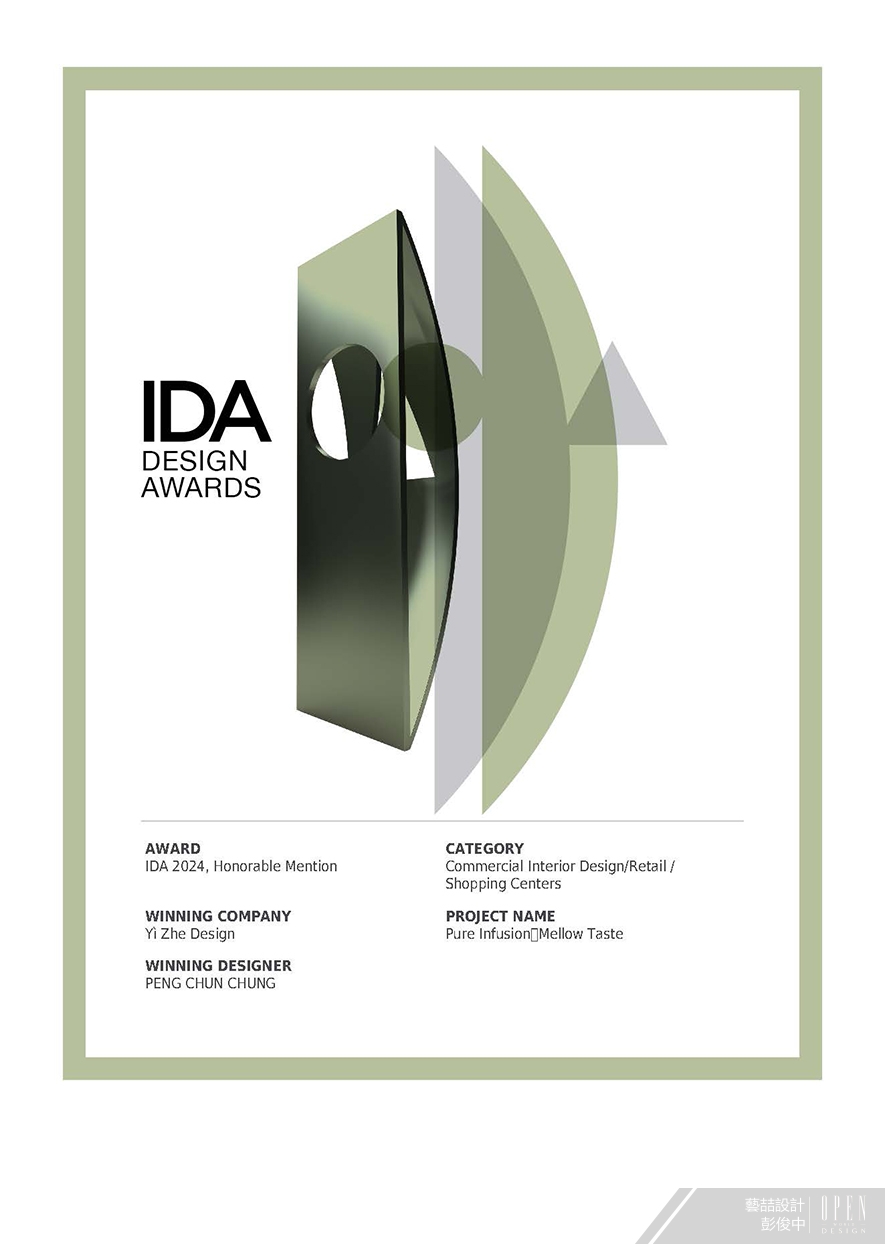 美國IDA 國際設計大獎(International Design Awards),旨在表彰「設立新標準」與「突破室內設計界限」、「改變人們生活和工作空間」的優秀設計師及團隊。以創新性、實用性和發展性等多種面向為評選標準,發掘建築、室內設計、產品設計、平面設計和時尚方面的新興人才,每年吸引來自數十個國家的頂尖設計者,競相角逐此項權威大獎!藝喆設計 設計總監 彭俊中 以簡潔的黑白二色輔搭柔和木質,營造俐落及溫潤的對比感受外,圍塑一抹時尚不失暖意的悠閒氛圍,而環繞場域逐層疊高的方形木支架,更形構酒液及浮冰的意象,彰顯商空性質;精緻迷人之作《釀粹‧悠淳》參賽2024 International Design Awards脫穎而出,喜迎「Honorable Mention」榮耀!