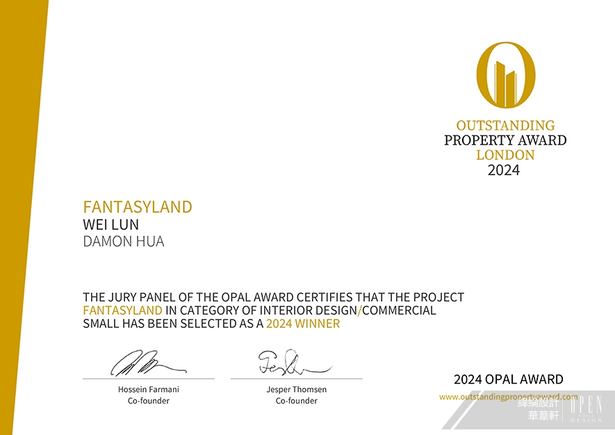 OUTSTANDING PROPERTY AWARD LONDON,OPAL(英國倫敦傑出地產大獎)由全球知名企業集團Farmani Group組織,並以招攬全球最佳建築師、室內設計師與房地產開發商為目標,在創造異業菁英聯合平台的同時,找尋各地最富創造力、革新感、社會影響力與永續性的設計方案。參與者有機會替自己最新穎的企劃,博得國際能見度,並且和產業的先驅及專業人士進行交流。為烘襯商家主打飾品的魅力,緯綸設計 設計總監 華葦軒 保留案場既有的溫潤木質作為基底,陳列櫃面則施作鮮明大膽的對比色彩,搭配多盞燈光聚焦,彰顯商品緻麗美感的傑出設計,成就高雅亮眼的摩登商空《Fantasyland》,贏獲評審團一致認可,抱回本屆賽事「Winner」榮耀!