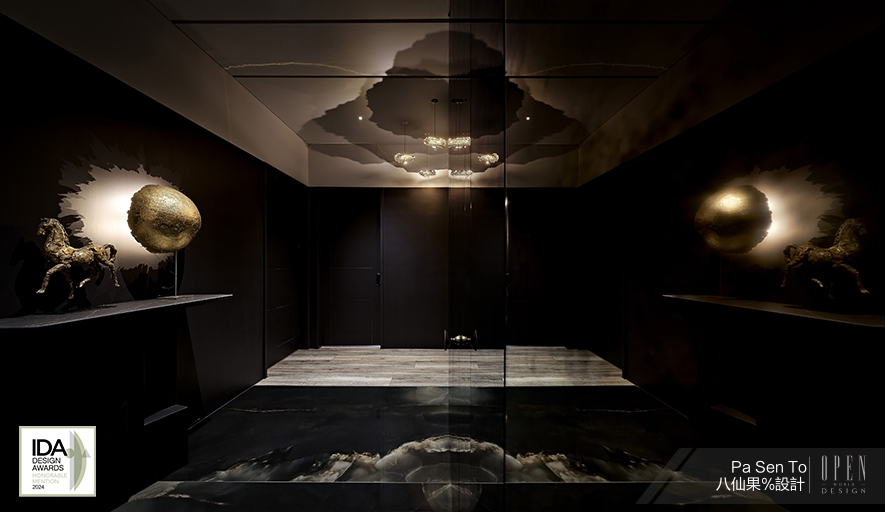 ▲廊道區延續公領域的闃黑調性,以黑色鏡面地磚,鋪塑迷幻氛圍,如同步入深邃的宇宙走廊。