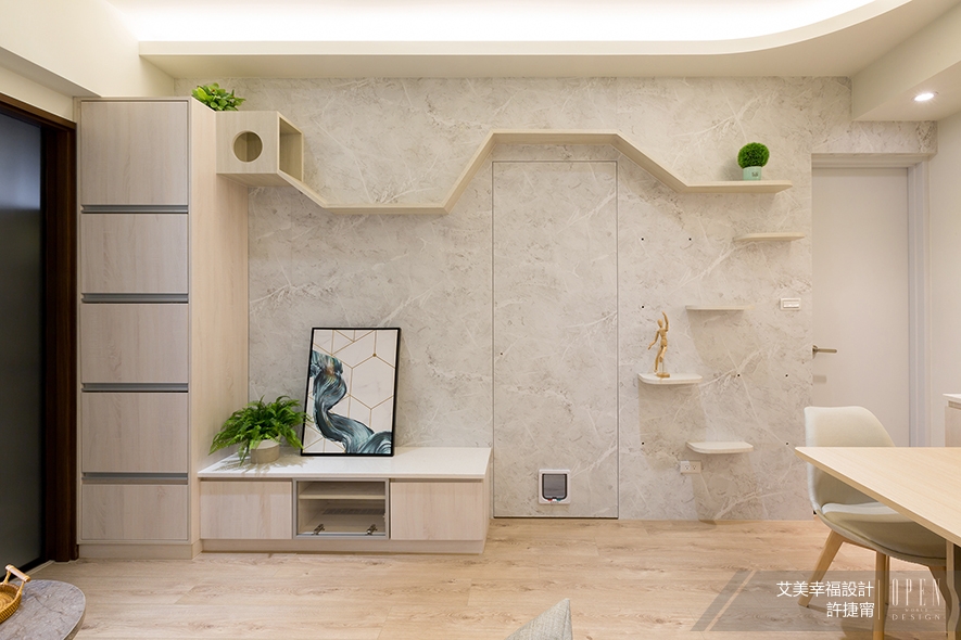 前述提及的《輕思.享漫》中,電視牆上方的貓跳台即依循此安全原則,且許總監更於一旁附加反向導角路線,使貓咪享有更多自由探索的動線,其設於沙發對向牆面的安排,也讓屋主無時無刻都可看見愛貓或活力跑跳、或慵懶入睡的模樣。兩位業主對這樣的設計讚不絕口,她也開心地分享:「瞭解、滿足居者需求,甚至比他們想的更多、做的更多,這就是我一直在追求帶給業主『幸福』的設計。」