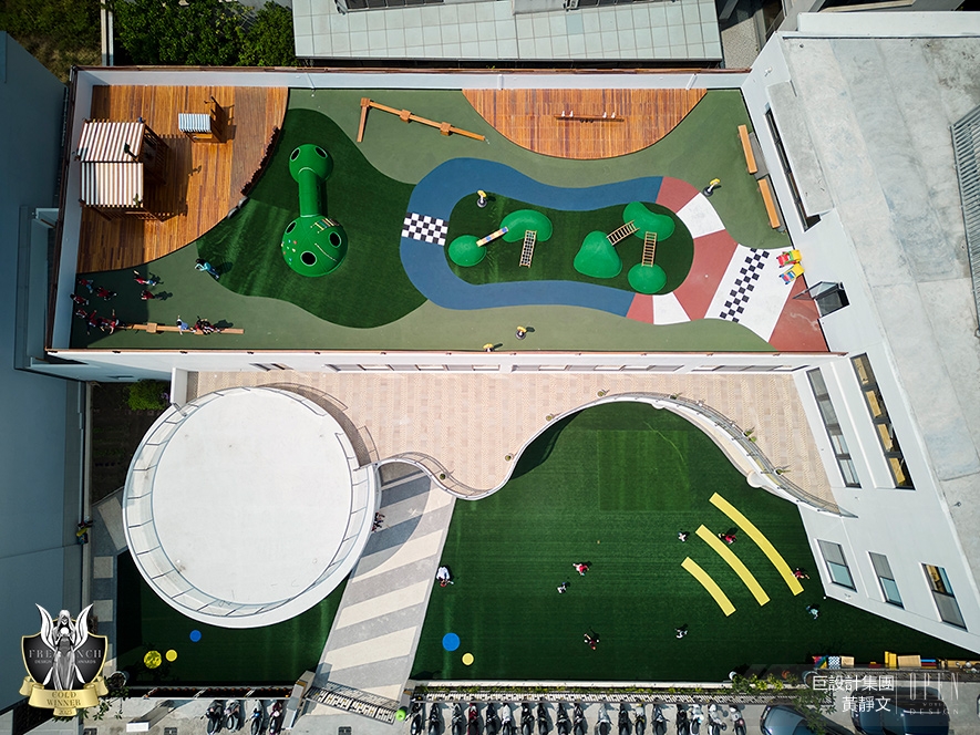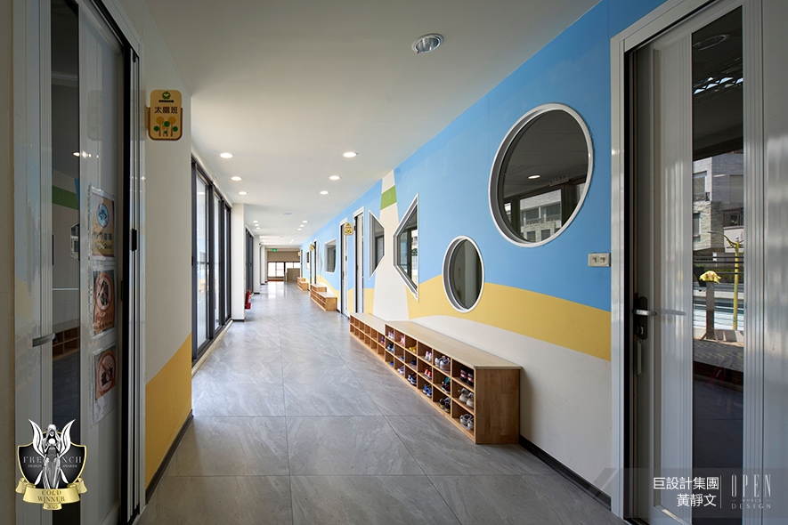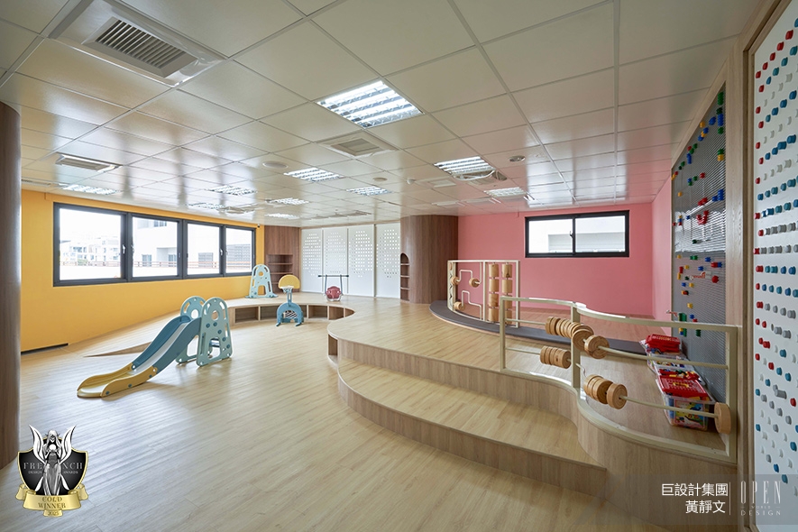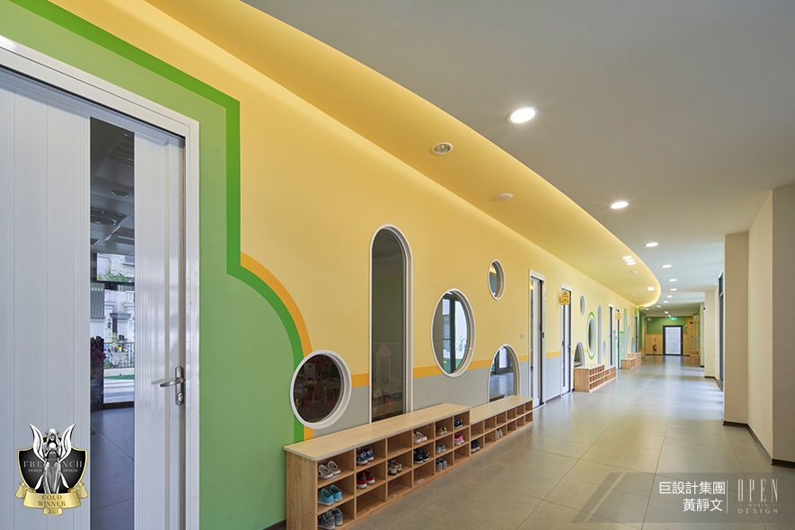 巨設計集團 執行長 黃靜文 思及空間主要使用者為好奇心旺盛的幼童,便於園區內遍施鮮明亮彩,佐搭圓潤柔和的曲弧流線、俐落幾何窗型,不僅創造多變的視覺層次,更予以孩子們活潑趣味的活動環境;靈動幼兒園《流光趣憶》受到本屆賽事評審矚目,光榮贏獲「金獎」榮譽!