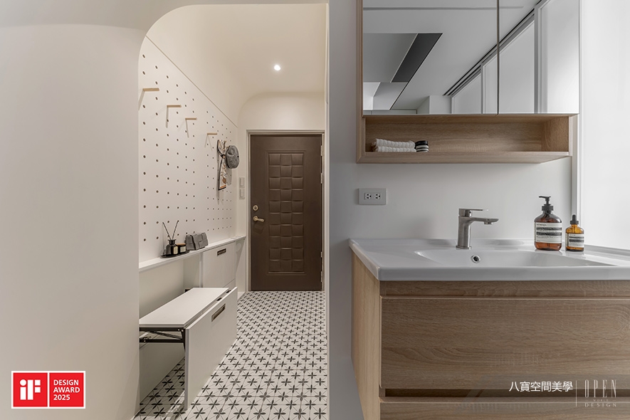 ▲甫入玄關,白色為主的簡雅花磚與洞洞板映入眼簾,緩和整日奔波的匆促步調,銜接更加純淨的宅邸風格,前方的半拱門造型和櫃下線條則引導人們深入宅內,享受簡單美好的生活。