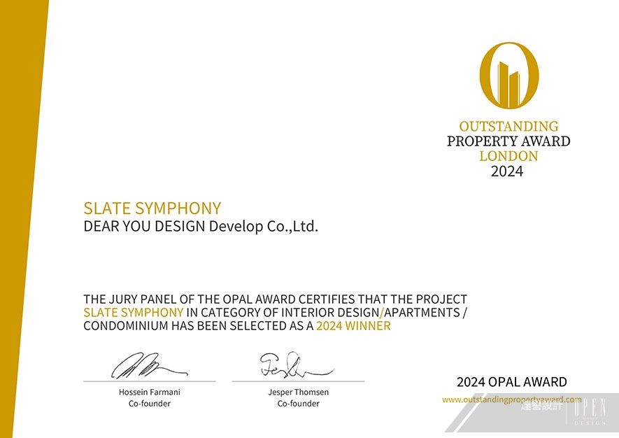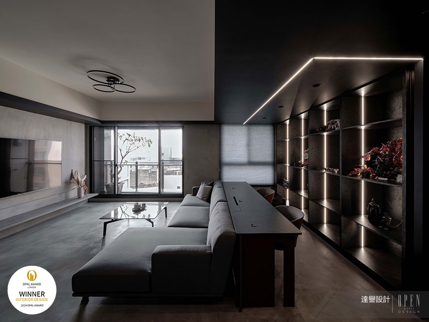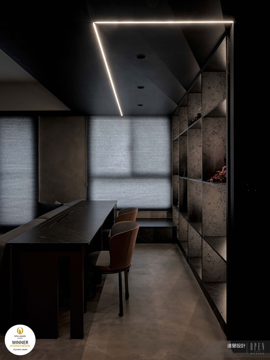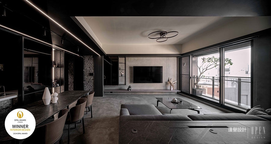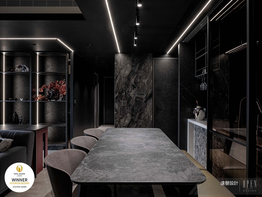 OUTSTANDING PROPERTY AWARD LONDON,OPAL(英國倫敦傑出地產大獎)由全球知名企業集團Farmani Group組織,並以招攬全球最佳建築師、室內設計師與房地產開發商為目標,在創造異業菁英聯合平台的同時,找尋各地最富創造力、革新感、社會影響力與永續性的設計方案。參與者有機會替自己最新穎的企劃,博得國際能見度,並且和產業的先驅及專業人士進行交流。回應屋主對黑色的喜好,達譽設計團隊 於空間整體遍布層次暗調,彰顯墨色神秘靜謐的沉穩氛圍之餘,以較淺的藝術漆肌理、不規則石材花紋,篆刻獨到的自然氣息,成就細緻不失寧靜自在感的絕美屋宅《岩墨映照》,一舉躍上國際舞台,斬獲本屆賽事「Winner」優異佳績!
