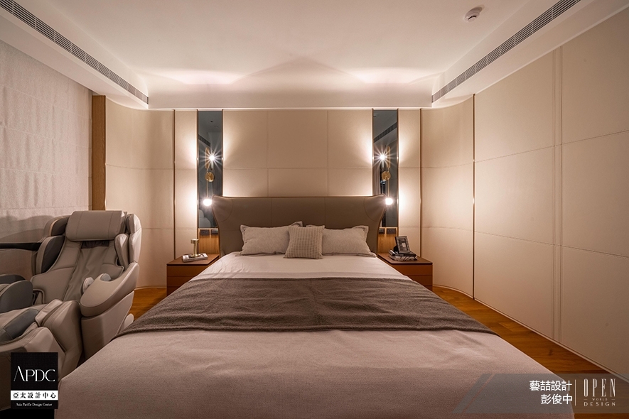 ▲臥室天花板採斜面設計,回應屋主前一間住宅的客廳語彙,而床頭背板則選用弧形皮革面,與本案公領域相呼應,悄然埋入巧思心意。