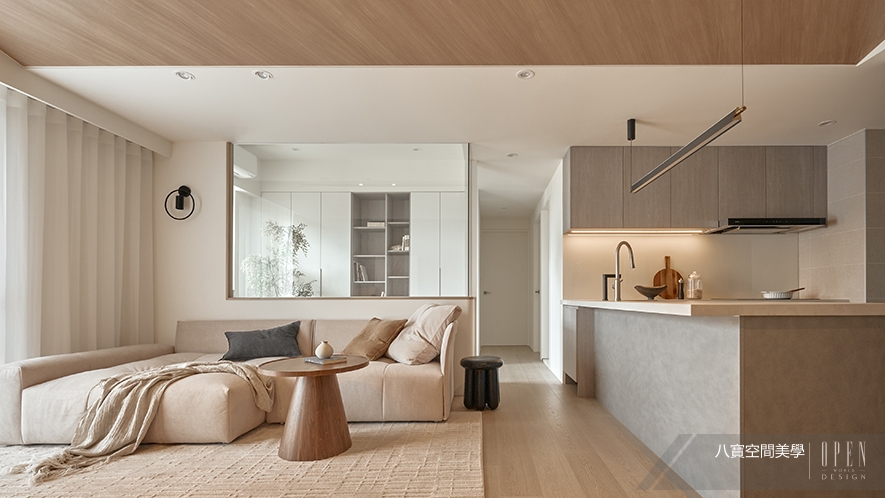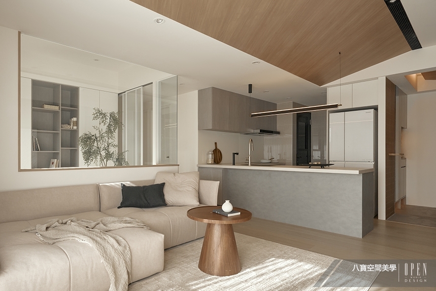 斜面天花輕柔低垂,如溫暖臂彎將歸家的疲憊輕撫,自然光穿透落地窗灑入室內,為空間披上一層溫柔的薄紗。黑色線條俐落地串聯起白色天壁與溫潤木質,將現代機能巧妙隱匿其中,與美學在一線之間達成默契,賦予頂部輕盈而精緻的存在感。場域中央,卡其色沙發慵懶舒展,依偎深木色圓錐茶几,底下米色編織地毯柔軟鋪陳,與微水泥中島的灰色理性形成精妙對比,溫潤、俐落在此找到最恰如其分的平衡點。八寶空間美學 巧妙運用高低錯落的天花板設計,將結構限制轉化為視覺亮點,且拆除隔間後的開闊視野,讓每個生活場景都能自然銜接,創造更多相聚時刻——孩子的笑聲在空間中自由流轉,父母的關愛目光隨時相伴。大地色調的溫潤基底上,材質的細膩變化訴說著不同的故事:木質的溫暖包容、微水泥的沉穩內斂、織物的柔軟親切,自然質樸與都會洗練相融,構築層次豐富、動靜皆宜的無壓美學。