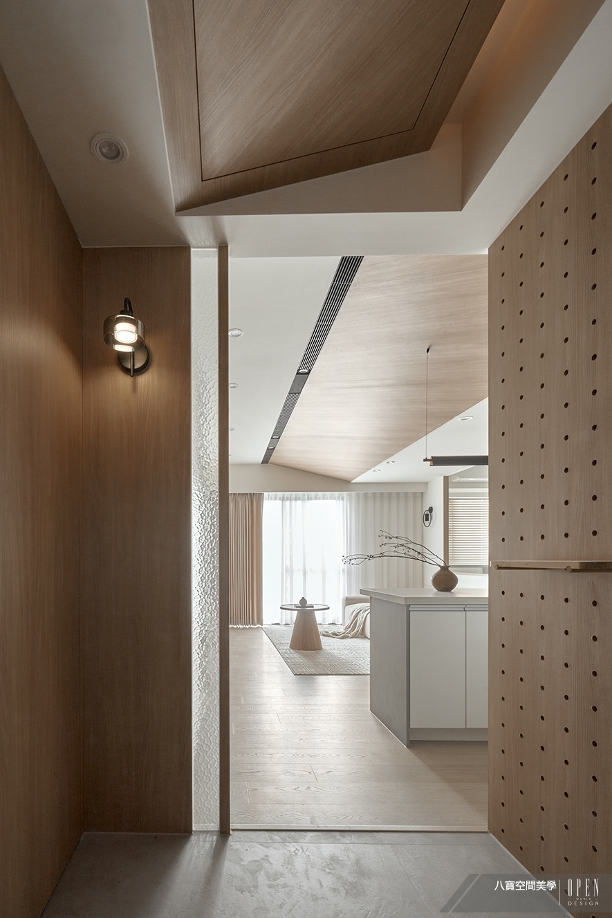 輕踏入室,斜面天花以優雅弧度劃破平淡,與後方開闊客廳形成層次遞進的視覺韻律。玄關處的灰色地坪與室內淺木色地面形成對比,在足下延展出明確的空間界定,引領歸者於此褪下塵埃,步入家的溫暖懷抱。左側柔光壁燈輕柔綻放,與四周溫潤木質相互呼應,營造出卸下疲憊的靜謐角落;對向洞洞板以其靈活多變的收納姿態,將物件化為動態的居家藝術展示,在重組與調整間展現日常的多樣可能。隱藏式儲藏門片悄然融入同色系牆面,弱化實體門扉存在感,使收納機能與空間美學達到平衡,在簡約的畫面連貫中保持整潔有序。