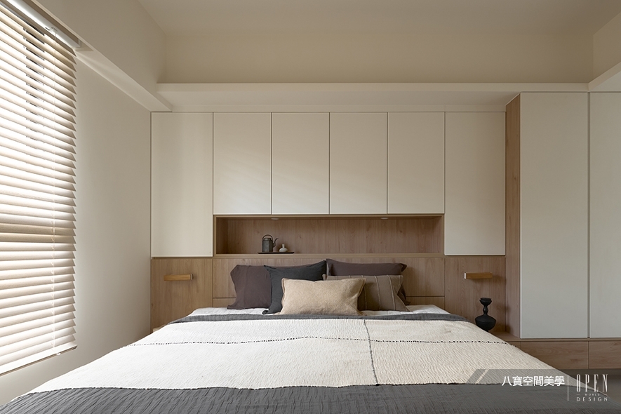 推開臥房門扉,純白與木質在此相遇,輕柔包覆整個空間。窗邊百葉簾片細膩篩濾著日光,將光影切割成一道道平行的韻律,輕柔地鋪陳在素淨的床褥與地板上,為靜謐的私密場域增添幾許生動。床頭後方木色床頭櫃與純白儲物櫃體融為一體,線條流暢如行雲流水,既保持視覺的簡潔純粹,也滿足日常收納的豐富需求。睡眠區與更衣室之間,精巧的對開鋁框門作為空間轉折,開合之間盡顯生活的彈性與從容。