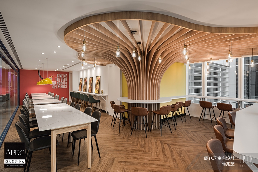 ▲員工餐廳藉木紋板材和圓形燈泡構築果樹的意象,象徵智慧開花結果之餘,令樹型虛化L型的銳利轉角,流動的線條也造就開闊、延展的視覺效果。