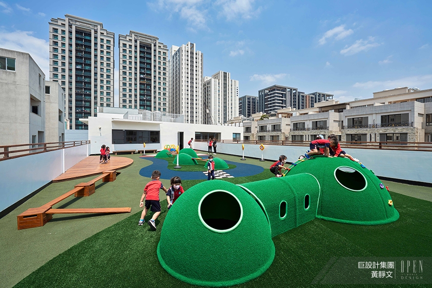 ▲思及幼兒園不定期舉辦活動,一樓開闊的廣場便於園方彈性使用,同時善用頂樓空間,規劃為設施豐富的遊戲場,給予孩子們一處自由跑跳的小天地。
