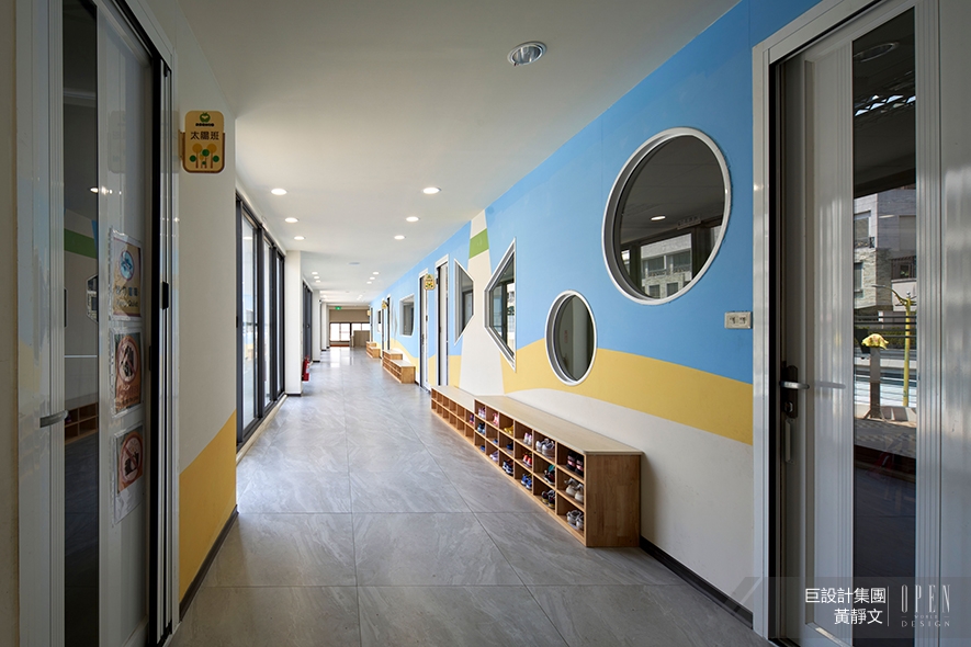 ▲走廊以繽紛色彩和弧線點綴,不僅呼應建築外觀造型,更彰顯幼兒園柔潤溫和的形象,令教學場域在自然天光、天壁柔光的托映下,呈遞輕盈和緩的氛圍。