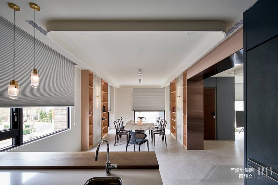 ▲餐廳與開放式廚房相連,L型廚具嵌入淺灰牆面,佐搭鐵件層架打造簡約美感。中島結合吧台,靈活運用為輕食區與工作台面,上方錯落的吊燈使其成為視覺焦點;一旁選用石材與木作交織的餐桌,搭配引入庭院綠意的穿透櫥窗,呼應「禪意休閒宅邸」的調性。