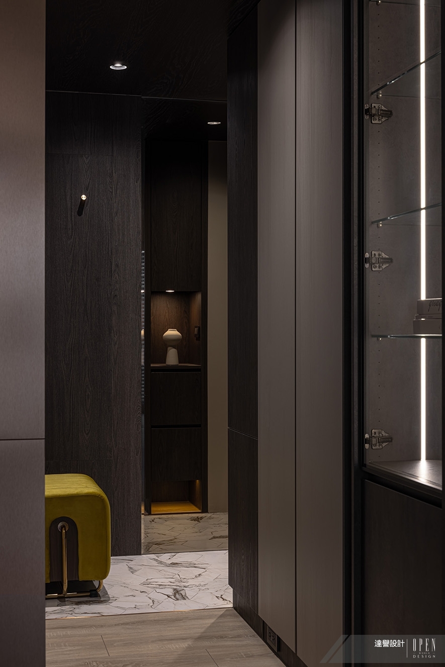 輕啟門扉,旋即可見立於深木色壁龕中的素雅展品,聚光燈將暖光遍撒其上,令藝術美作彷若一盞點明方向的燈塔,守候家門並迎接歸人到來;而足下純淨的六角石紋磁磚,開展如星象羅盤般的迎賓儀式感,又與亮黃矮凳拼湊一方色彩輕快的幾何圖景,於深沉的木紋立面間形成鮮明亮點,既創造舒緩柔潤的過渡場域,也喚起人們對家的熟悉與安全感。