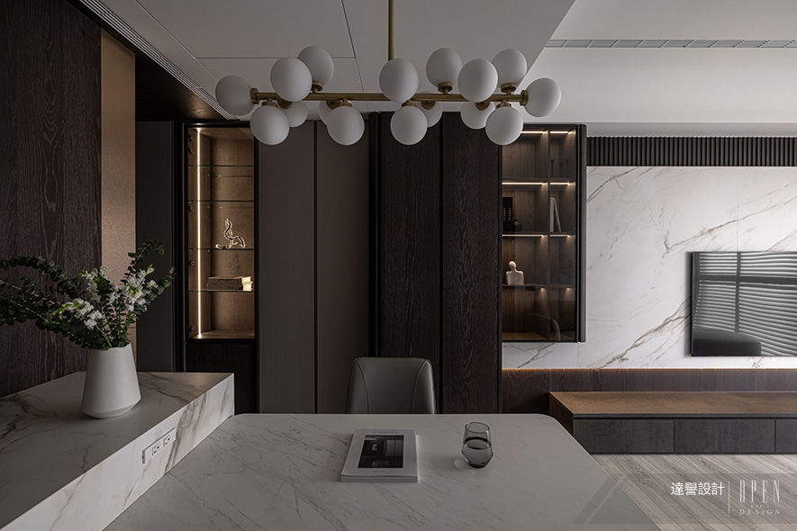 從大片暗沉木材、淡色石質,至妝點細處的鍍鈦金屬、藝術塗料,達譽設計團隊 掌握迥異材質的每份質感特性,創造柔煦迷人的細緻現代感,亦將業主收藏化作繽紛空間各隅的點睛之件,讓無聲的空間自行道盡居住者的精采故事,更陪伴三口家庭邁向耀眼明亮的未來生活。