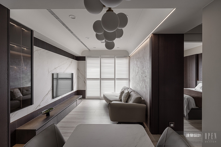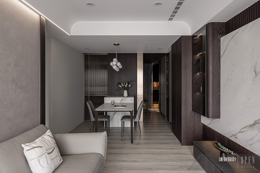 客廳作為視覺主軸的電視牆中央鋪敘淺色石紋,上下則交織暗沉木韻,透過天然木石肌理豐富牆面層次,配合局部木質格柵、窗畔百葉窗水平垂直錯落的線條元素,與圓弧天壁的柔曲流線、旁側餐廳的圓角餐桌和圓形造型吊燈相對,不僅勾畫剛柔並濟的線性美學,更讓時尚俐落的空間中,挹入親切圓融的舒適氛圍。