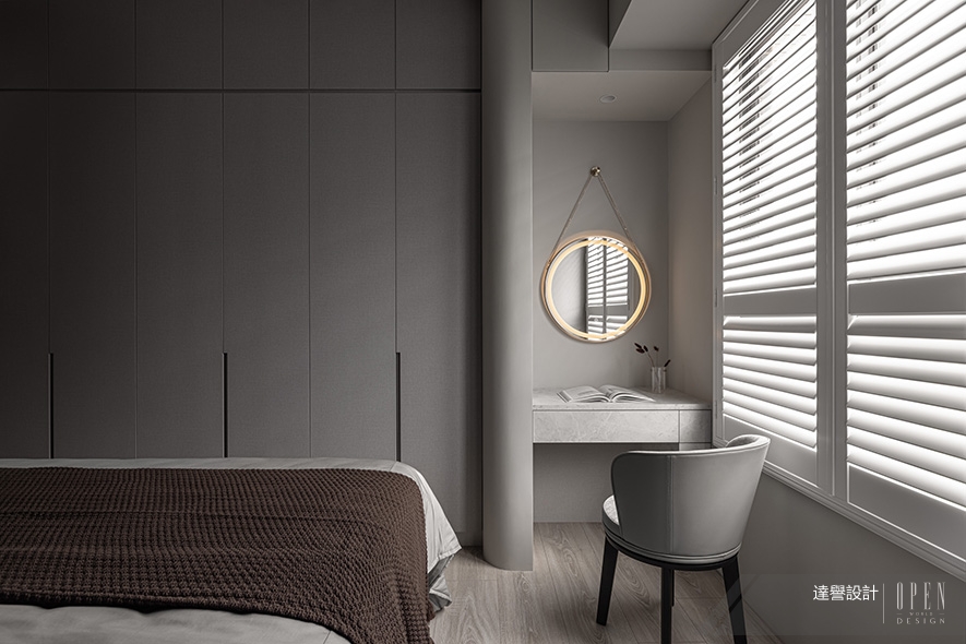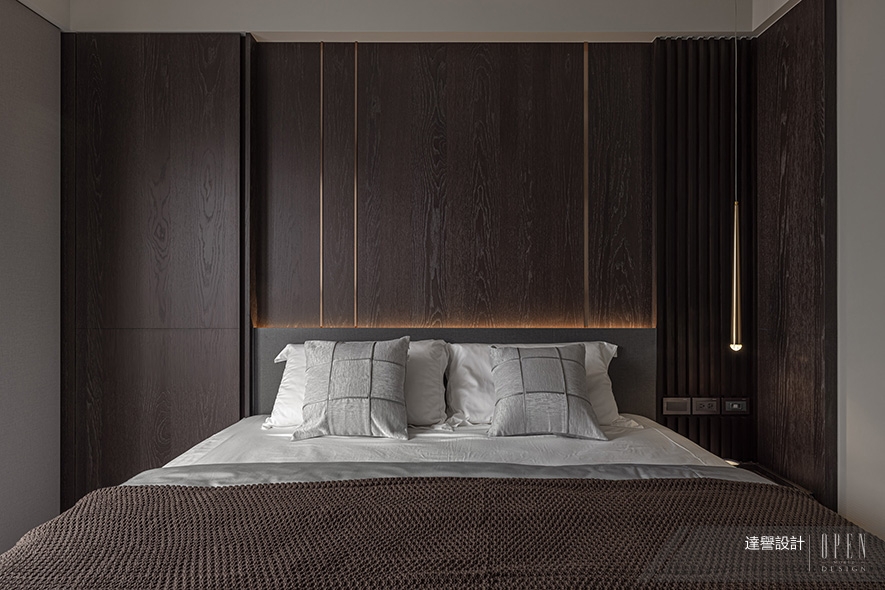 當公區主色之一的淨白色調進入私領域後,流轉為自床尾延伸窗畔的低調柔灰,房內霎時湧出素樸純粹的簡約風範,此時轉而望向床頭,深褐木皮攀爬、浸染整面立面,其間嵌入數條精緻的玫瑰金飾條,藉發散的金屬質感與暖金光澤,呼應角落懸掛的同質椎狀吊燈、床背板藏設的鵝黃間接照明,進而醞釀穩重時髦的低奢雅趣;深淺色彩與異材質地在素樸與典雅之間勻稱調和,成就這片蘊藏金光的雍雅場域,也實現一處充盈居者喜好、供其沉澱心靈的和暖憩息場所。