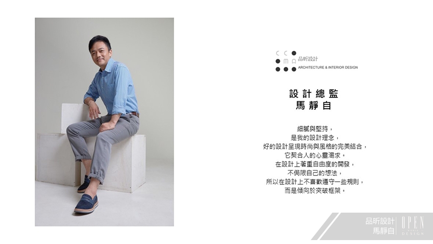 「我認為設計是富含蘊底的,它架構在文化與傳統上,並以其為基礎創造新的態度。」品昕設計 設計總監 馬靜自 重視各式設計的起源及文化,卻不侷限於傳統手法及設計框架,以創新自由的前沿思想,於家宅間連結使用者個性、於商空場景內彰顯品牌故事,實現靈活多變的訂製設計;未來,馬總監也將繼續運用細膩美感及專業技藝,鋪敘嶄新多元的屋中美景,讓室內設計引出空間的深度價值!