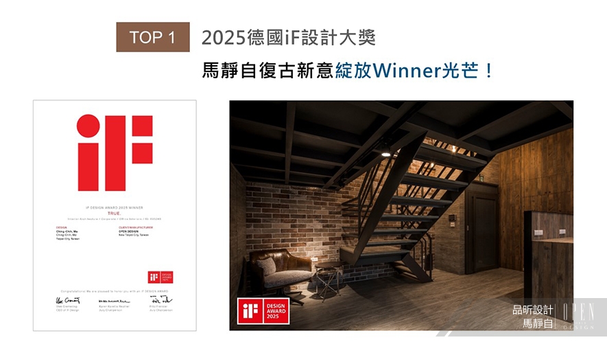 世界四大設計獎之一的德國 iF 設計大獎,自1954年創辦至今,已在國際間擁有無可取代的指標性及前瞻性。馬靜自總監運用新舊交融的設計哲學,透過樓梯扶手、挑高壁面與夾層辦公室外的不規則幾何線條,創造豐富趣味的視覺層次,締造懷舊而獨到的辦公場域《TRUE.初 空間》,勇奪賽事「Winner」殊榮,令品牌的卓越創意於世界舞台大放異彩!