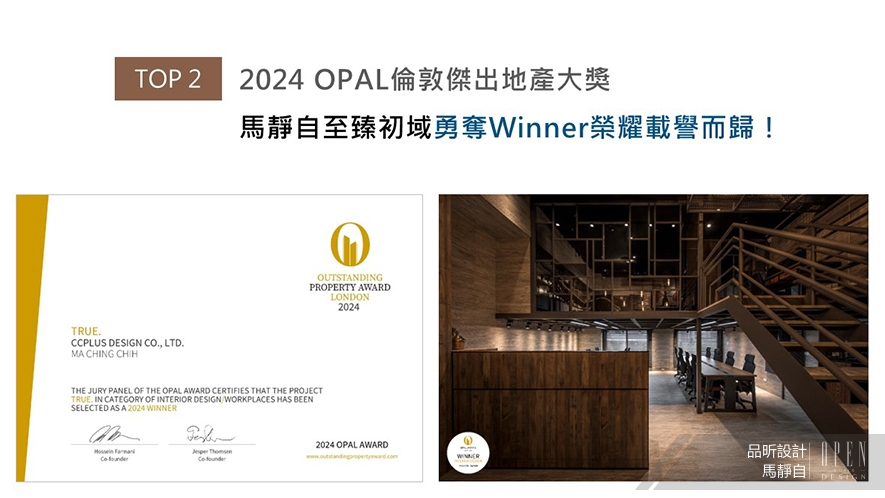 OPAL由全球知名企業集團Farmani Group組織,力求各地最富創造力、革新感、社會影響力與永續性的設計方案。品昕設計為全新建築中的辦公室《TRUE.初 空間》灌注復古工業風,從自然原木的溫潤質感,到金屬幾何的俐落線條,交織出「新舊合一」的吸睛場域;獨具創意的細膩空間表現成功打動評審,榮獲本屆賽事「Winner」大獎!