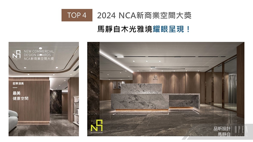 NCA新商業空間大獎由廣州設計週創立,專注邀請新型商業空間相關產業的業主參與評選,以推動行業創新發展。順應品牌高雅內斂的形象,品昕設計團隊融合溫潤木製、純淨白調與深沉石材,交織溫暖舒心的療癒空間,品味滿盈的醫美商空《韶華漫美》,一舉抱回「最美健康空間」榮耀!