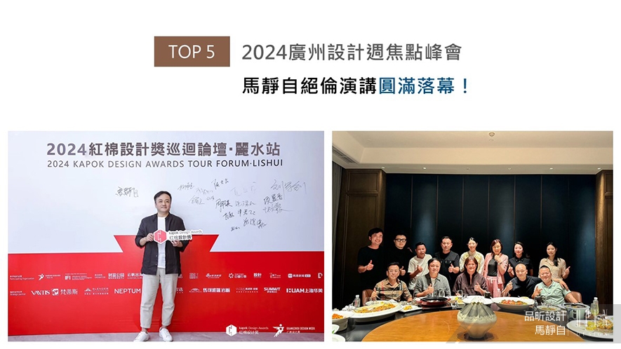 「致敬華語設計這些年」由廣州設計週聯合眾多華人媒體及設計服務機構,期許藉由與影響華語設計圈的傑出人物暢談設計界發展,達至深入探討業界趨勢的目的。馬總監細品每位業主背後的往昔軌跡,以縝密不失質感的講究設計,化各式元素為蘊含深意的精美之作,盡展屋主的獨到特質,優美創作和深遠理念驚豔主委會及評選團隊,獲選「年度百位卓越設計人物」之一!