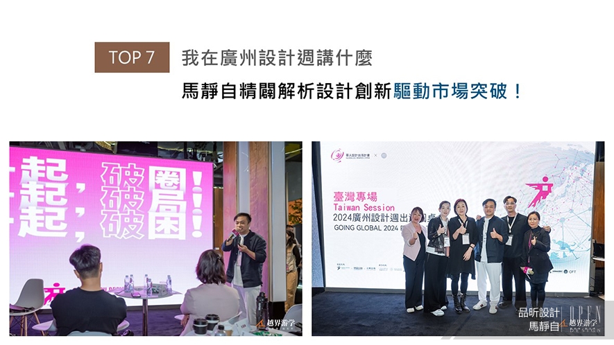 品昕設計總監馬靜自為廣州設計週2024年12月7日的臺灣專場活動,準備「中國品牌出海台灣地區、美國市場之我見」的主題演講,分享如何在市場競爭中找出突破點,亦點出設計師應從使用者的角度出發,將設計轉化為更具生命力的作品;內容專業且精彩絕倫的演講,讓當日參與的海內外設計師們大飽耳福,收穫滿滿的創新見解與設計啟發!