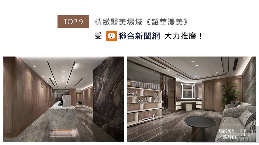 考量醫美品牌的項目定位,馬靜自總監採用玫瑰金鍍鈦飾條鋪敘空間細處,搭配嚴選的藝術展品,彰顯如精品店般的華美大氣感,且於立面、櫃體選配具優秀阻燃性的火立克板材,造就滿足美觀及安全功能的醫療環境,精美作品《韶華漫美》喜得聯合新聞網上刊分享!