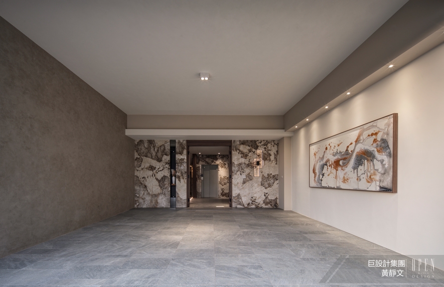 行至入口,一面氣勢磅礡、水墨潑灑般的石紋牆,在燈光映照下呈現層次豐富的光影變化,之間黑色端景檯如書法中墨線,勾勒自然不羈的藝術表情;中央同樣以深色框架門扉,配合上方的橫向格柵紋,營造視覺延伸的放大效果,也形塑大氣而優雅的入口印象。門後,大面積灰色塗料溫潤包覆牆面,上方配置精巧圓形壁燈,金屬洗鍊、玻璃清透在暖光渲染下散發精巧韻味,地坪延續與壁面形成和諧色調呼應的灰階地磚,圍塑既有自然野趣又不失都會風雅的迎賓氛圍。