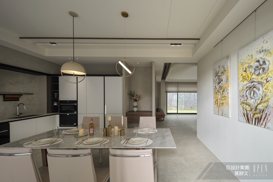 餐廚區域以開放式格局串聯家人的日常時光,中央灰白相間石紋如雲霧般流轉於大尺度餐桌,展現天然紋理的優雅韻味,與上方懸掛的兩盞金屬圓環藝術吊燈,共構一剛一柔的質感視覺饗宴,搭配右側牆面上色彩繽紛的花卉藝術畫作,為此注入生機活力。內裡廚房區採用極簡的白色櫥櫃配搭深色開放層架,乾淨俐落的線條與隱藏式把手設計,彰顯現代廚房的機能美學;而烹飪區牆面呈現自然斑駁紋理的灰階牆面,營造兼具藝術品味與實用機能的生活場域。