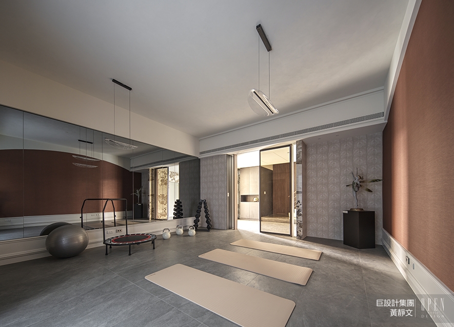 此處以沉穩的灰階石紋地坪為基底,搭配一側如夕陽餘暉般溫潤的赤陶色牆面,為空間注入煦暖能量;對向整面鏡牆延伸視覺縱深,映照出寬敞的運動場域——不論是鋪展瑜珈墊的靜心伸展,或是運用器械的勁力鍛鍊,皆能自在暢行、一覽無遺,成為每一次吐納舒展與力量迸發間,收藏專屬寧靜與活力的歸所,成就一處既具現代感又不失溫度的多功能場域,幫助使用者實現從容自適的理想生活風景。