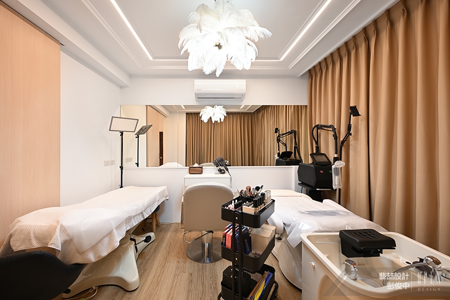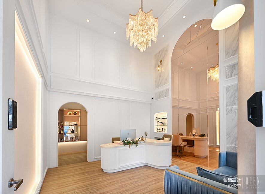 舉例來說,醫美診所依法須將消防警報器設置於離地120公分、櫃檯正前方的顯眼位置,然而,鮮紅的警示裝置,與診所追求的寧靜療癒氛圍格格不入。藝喆團隊的解法是:精心設計大型滑門櫃,平日隱藏警報器,僅在消防檢查時開啟。如此細膩巧思,正是平衡法規與美學的專業所在。