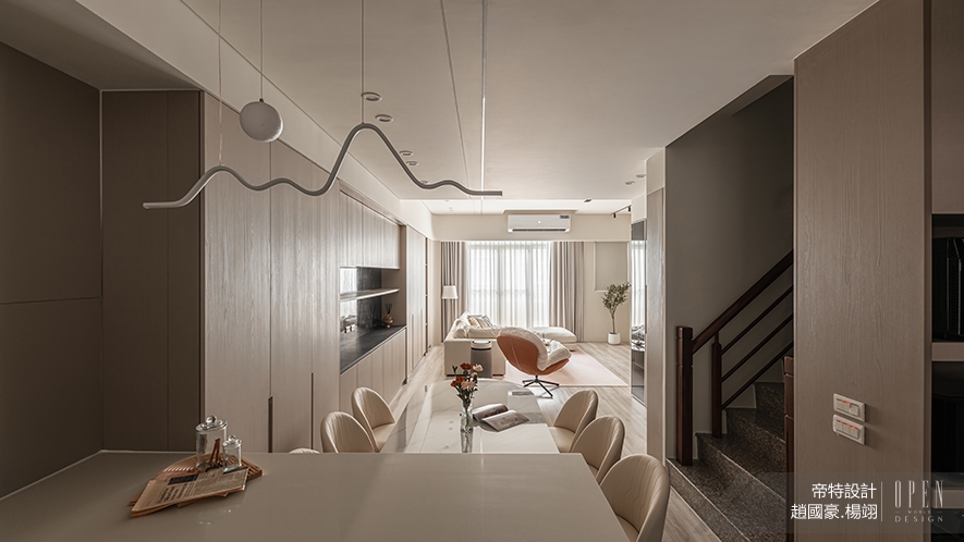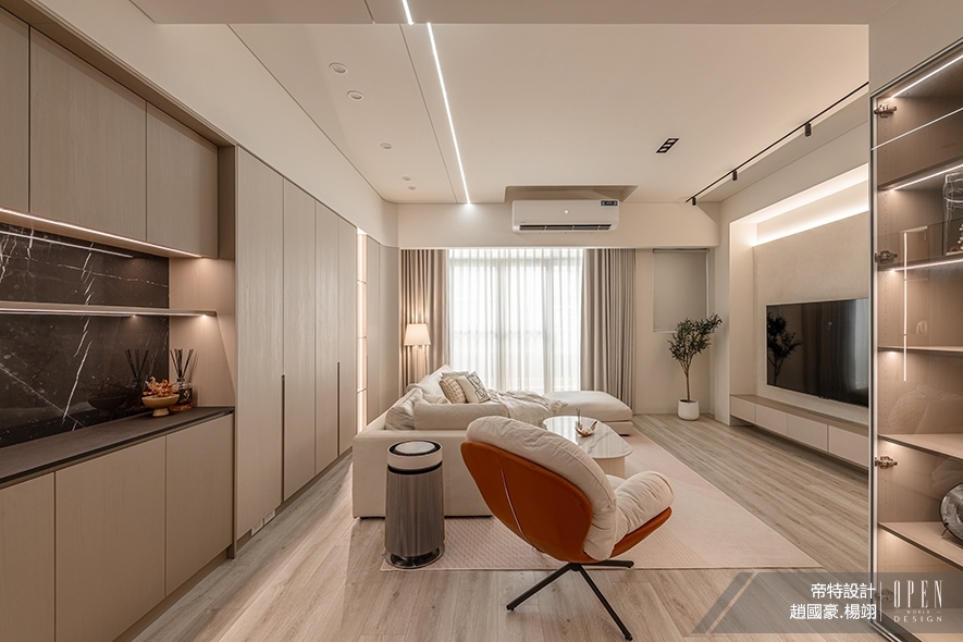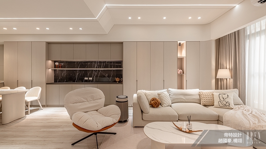 帝特設計 品牌總監 趙國豪、設計總監 楊翊 秉持對當代居住品質的深刻理解,透過暖米白色、淺灰與奶茶色系的細膩鋪陳,搭配多處間接照明的光影暈染,創造如雲朵般的柔和包覆感;之中以圓弧造型軟裝元素點綴,以及乳膠漆、石紋、木質等多元材質的對話,注入生活的溫潤質感;同時藉由流暢的開放式動線、展示與收納並重的櫃體規劃,將日常需求轉化為空間美感的一部份,成功演繹機能美學與居住溫度的和諧共鳴,實現設計團隊對於「無壓的溫柔、靜謐的日常」的作品期許。
