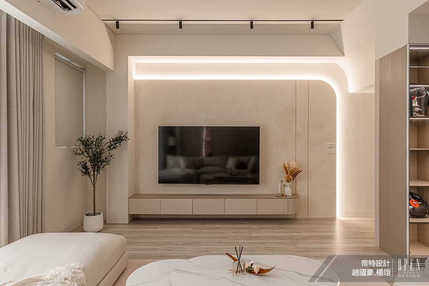 帝特設計 品牌總監 趙國豪、設計總監 楊翊 以輕淺白灰色系貫穿全室,從牆面延伸至天花板的柔和色調營造出雲朵般的包覆感,加之淺色木紋地坪與奶茶色櫃體的材質對話、開放式展示層櫃的生活景框、與圓弧軟裝的流線造型,進一步豐富溫雅感,配合多處間接照明呈現的光影層次,以及精心配置的綠植點綴,予以居者沉靜溫和的居家體驗,更展現出設計團隊對細膩氛圍營造的純熟掌握。