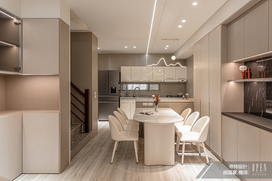 與餐桌無縫銜接的中島,利用不同高度以及純色檯面,巧妙區隔使用屬性,維持流暢動線,創造多元使用情境;後方開放式廚房延續米白色系櫃體,搭配淺灰色調牆面與料理台,打造明亮通透的烹飪環境。整體以光為引、以質感為韻,在簡約純粹中,成功演繹現代美學與生活溫度的和諧共鳴。