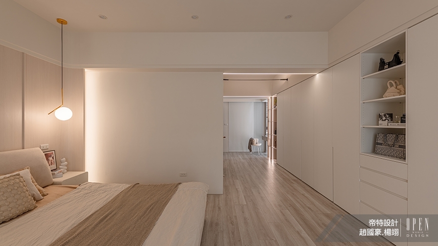 床尾嵌入式收納櫃體採用無把手設計,深化俐落簡約的視覺效果;旁側梳妝區開放展示格架錯落有致地陳列精品小物,便於日常拿取,另外鑲嵌的LED燈帶如絲綢般勾勒櫃體邊緣,注入光韻層次,每一層都彷彿藝廊般的陳設美學,盡展主人的品味生活。