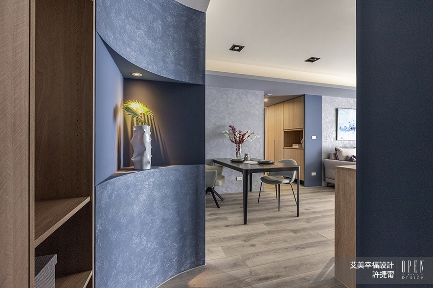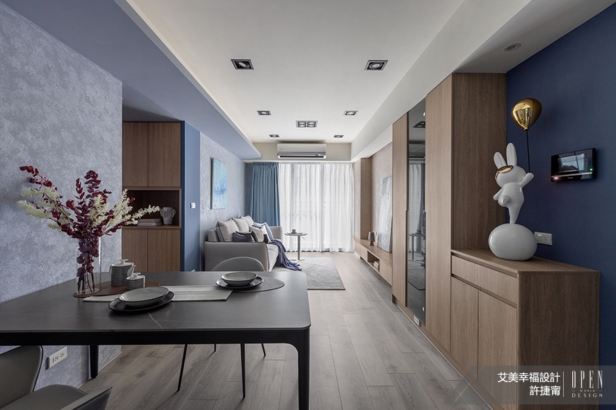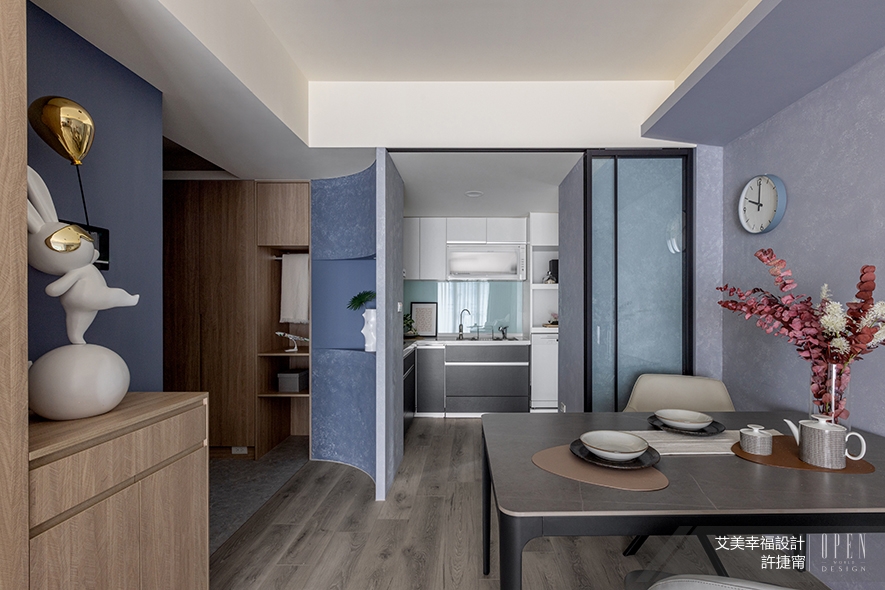 ▲餐廳設置飄逸時尚氣息的黑色圓角餐桌及灰色餐椅,和廚房內部的簡約黑白相得益彰,於細緻灰藍塗料質感中醞釀洗鍊雅痞風;客廳電視牆和沙發背牆以大地色系的素樸與天空般的清爽藍色漸層,仿擬業主美好回憶中,飛機起降時的每刻優美風景,伴其度過假期的慵懶小酌的閒適時光。