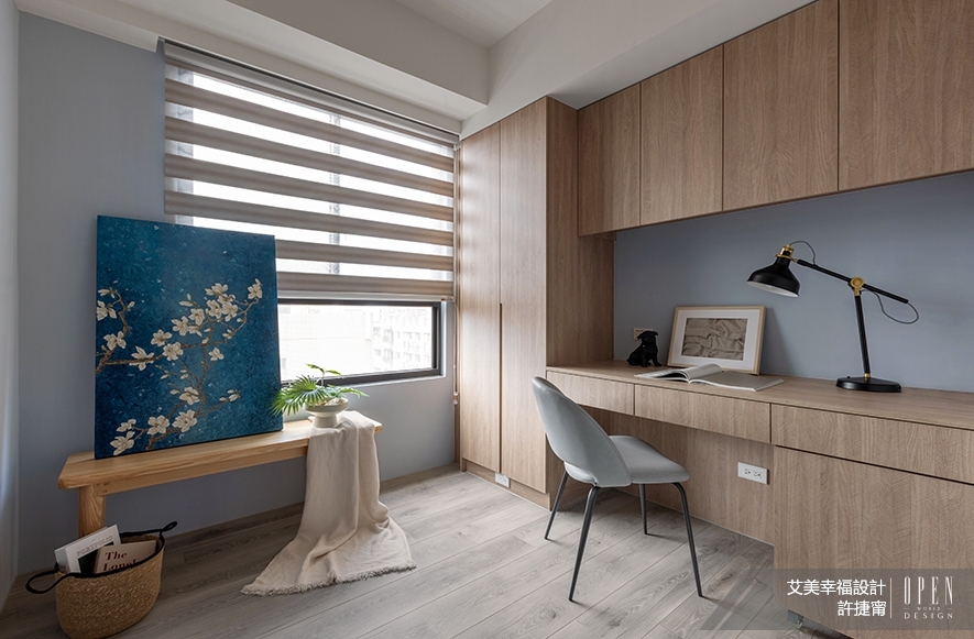 ▲書房以簡潔設計打造寧靜專注場域,貼合業主偶爾居家辦公的機能所需,而書桌區外預留的大片空間,則顧及親友來訪、未來家庭成員增加等可能性,令此處成為功能多元的彈性場所。