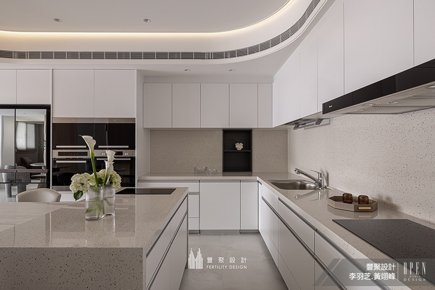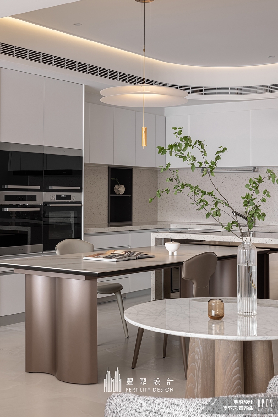 純淨潔白間參入少許暖灰,鋪陳彷若畫境的素雅餐廚區,開放式格局連結客廳與午茶區,讓下廚不再是孤單作業,而是聯繫家人日常交流、協作料理的溫馨起點。細緻白石紋的長型餐桌,留予一家齊聚的充裕空間,輔以中島特別配置的IH爐、四周豐盈機能的電器餐櫃,貼心呼應屋主佳節圍爐的使用需求。