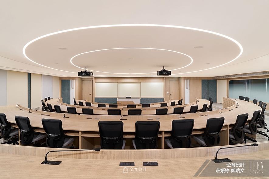 在氛圍營造上,最引人注目的莫過於天花的大型環狀線燈設計,如光環般凝聚視覺焦點,賦予優雅柔和的現代美感。局部牆面以藍綠藝術塗料點綴,引自然綠意入室,平靜的空間感受,也適當紓緩師生課堂中的緊繃壓力。