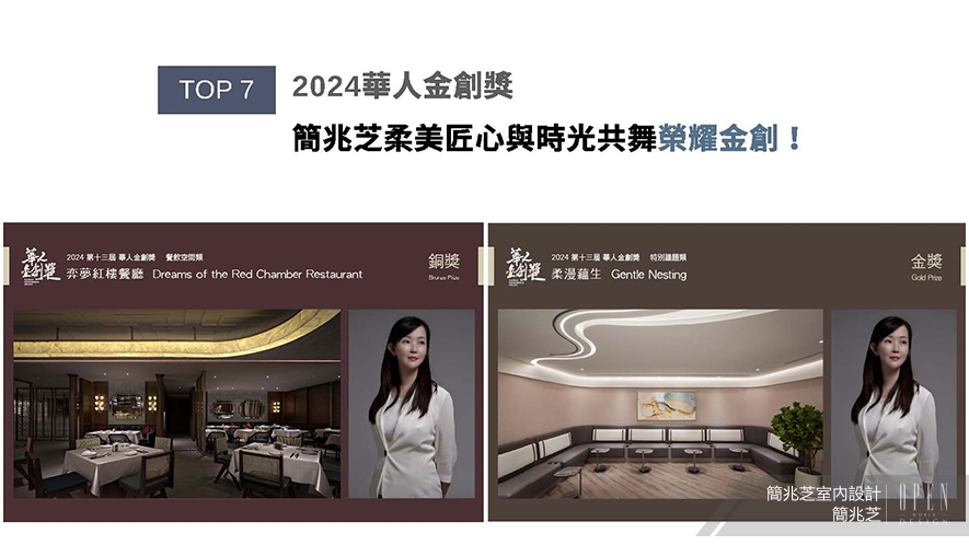 以「和諧、融合」理念巧妙演繹迥異場域的簡設計師,在醫療場域《柔漫蘊生》中彰顯醫療團隊呵護新生的使命感;而老上海風《弈夢紅樓餐廳》則使顧客在華麗復古氛圍中品味人生的圓融。兩件作品分別奪得2024華人金創獎「特別議題類」金獎與「餐飲空間類」銅獎榮譽!