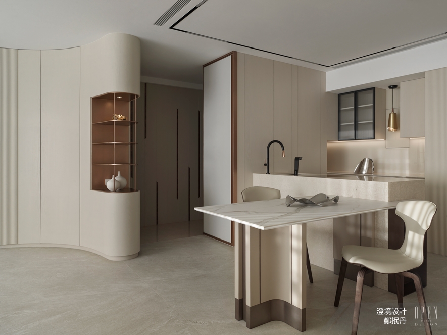 澄境設計 設計總監 鄭抿丹 以米色為基調,勾勒靜謐而溫煦的空間質感,並透過同色系的線板造型與弧形元素作為骨架,搭配木皮的質樸與石材的沉穩,讓空間在交織的線條與多元材質紋理中,展現層次豐富的美學深度;又運用眾多智能配置提升日常便捷性,打造舒適寫意的居住場所,回應家庭對生活品質的追求。每一處細節考量都體現團隊對居住本質的深刻思索,也為品牌的長久陪伴與持續關懷書寫最真誠的註解。