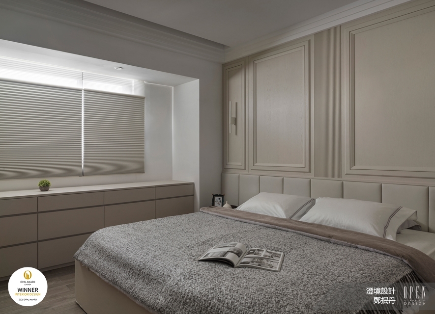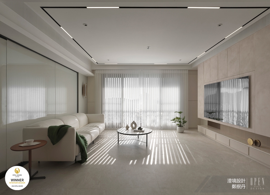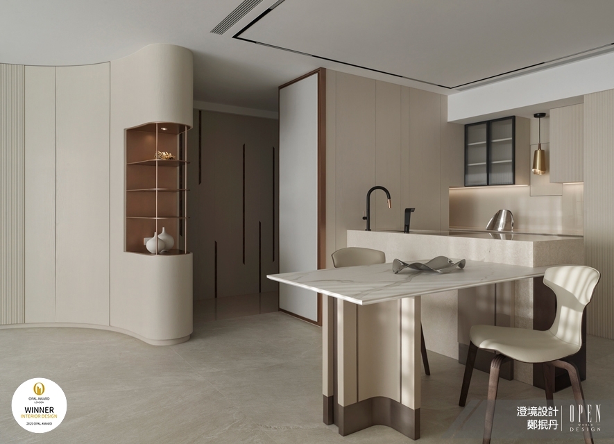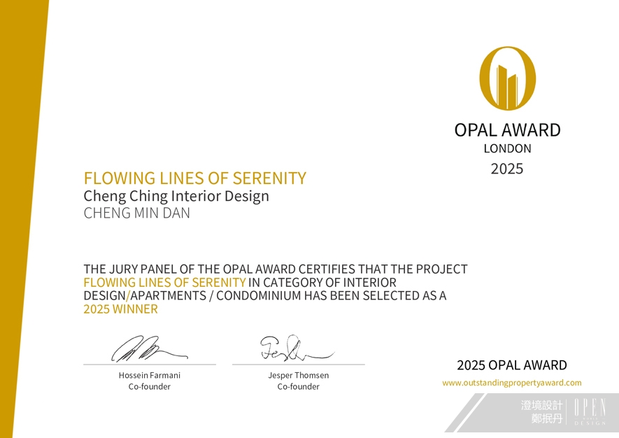 OUTSTANDING PROPERTY AWARD LONDON,OPAL(英國倫敦傑出地產大獎)由全球知名企業集團Farmani Group組織,並以招攬全球最佳建築師、室內設計師與房地產開發商為目標,在創造異業菁英聯合平臺的同時,找尋各地最富創造力、革新感、社會影響力與永續性的設計方案。本屆賽事中,澄境設計 設計總監 鄭抿丹 帶來家宅《弧光柔藝》與商業空間《淨光敘簡》雙作參賽,前者透過寬縫片簾捕捉自然光影,使其在水泥灰地坪上隨時序流轉,整體米色基調搭配簡約線板勾勒出溫暖舒心的氛圍;後者則以大地色藝術漆與柔和弧形背牆,化解冷硬石材的距離感,並運用靈活玻璃隔間兼顧開放性與隱私需求。兩案皆深刻體現大賽所倡導的「創造力」核心理念,於國際設計舞臺上展現精湛實力,雙雙獲得「Winner」佳績!