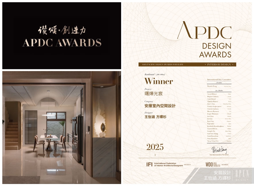 APDC亞太設計中心是室內設計聯合國組織IFI(國際室內建築師設計師團體聯盟)的全球成員,由該組織發起的APDC AWARDS,自2010年起每年舉行一次,今年已來到第16屆,是亞太地區最重要的獎項之一。2025年度,安厝設計 主持設計師 王怡涵、設計師 方繹杉 精選優美療癒之作《曙燁光宸》參與本屆賽事。作品中,團隊回應一家人期許空間「能共享也可獨立」的需求,客廳選配大型沙發串連居者們聊天互動的家庭時光,私領域則灌注沉穩暗色、浪漫摩卡等迥異色調,實現不同使用者對風格美學的喜好。由多方面顧及業主一家所需的舒心住所,受賽事評審團的讚許,贏得榮耀的「Winner」獎項!