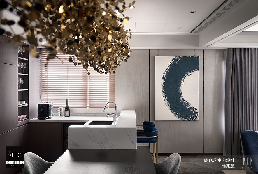 ▲餐廚區餐桌連結白色石紋吧台,提供輕食準備兼休閒的理想場所。一幅藍灰漸層的抽象畫作與另一側的圓弧水墨畫,為該區注入藝術氣息,同時再次呼應上空四顆吊燈,強調「圓滿」之意。