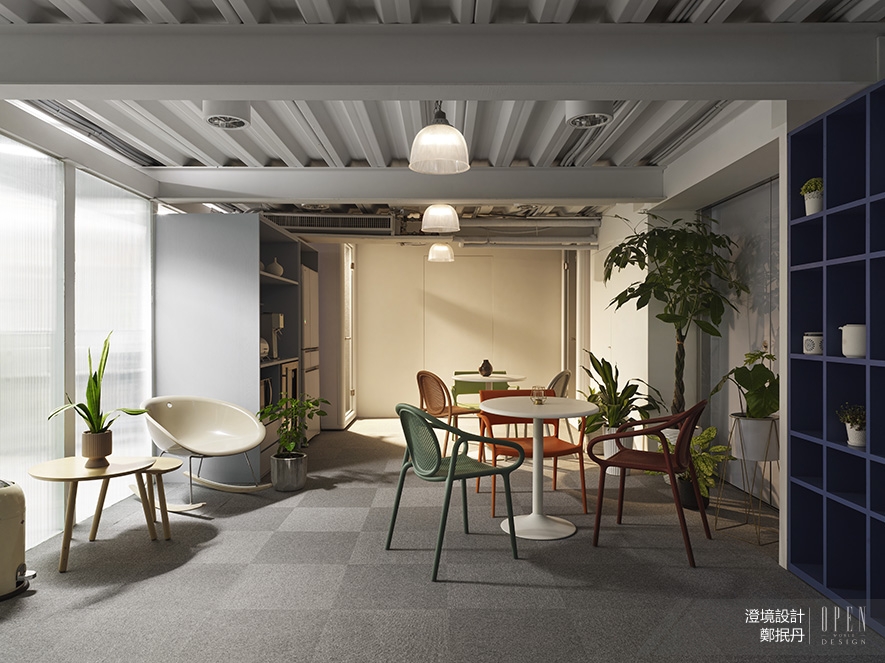 穿越理性的辦公區域,茶水間以意想不到的鮮明色彩迎接來者,進口座椅的紅綠跳色綻放勃勃生機,為日常工作間注入一抹燦爛朝氣;藍色收納櫃與企業識別色呼應,在強化品牌印記的同時平衡該區的色彩張力,整體在灰白背景的襯托下,實現活潑而不突兀的視覺效果,為休憩時光營造輕鬆愉悅氛圍。