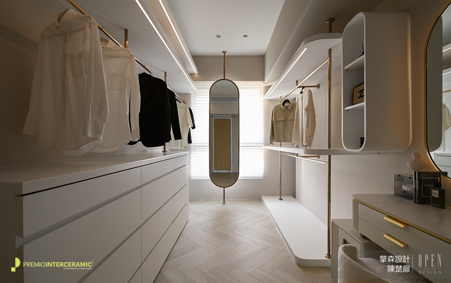▲主臥弧形木作床背板內藏暖黃間接光源,可作夜燈並營造舒眠氛圍;更衣室整合衣架、抽屜櫃與梳妝臺,並以伸展臺為概念發想窗畔淺金鏡面,提供住者一展美學的時髦舞臺。