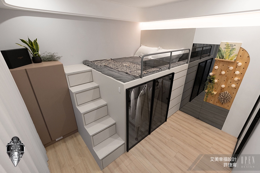 ▲主臥採用架高床體的立體配置,令睡眠區得以保留原始樓高與舒展呼吸感,旁側木質樓梯以紮實的手工榫接工藝鋪敘溫潤質感,床側護欄確保睡眠時的安全性,未來更可加裝紗簾增添隱私感,增強居住體驗的實用性。